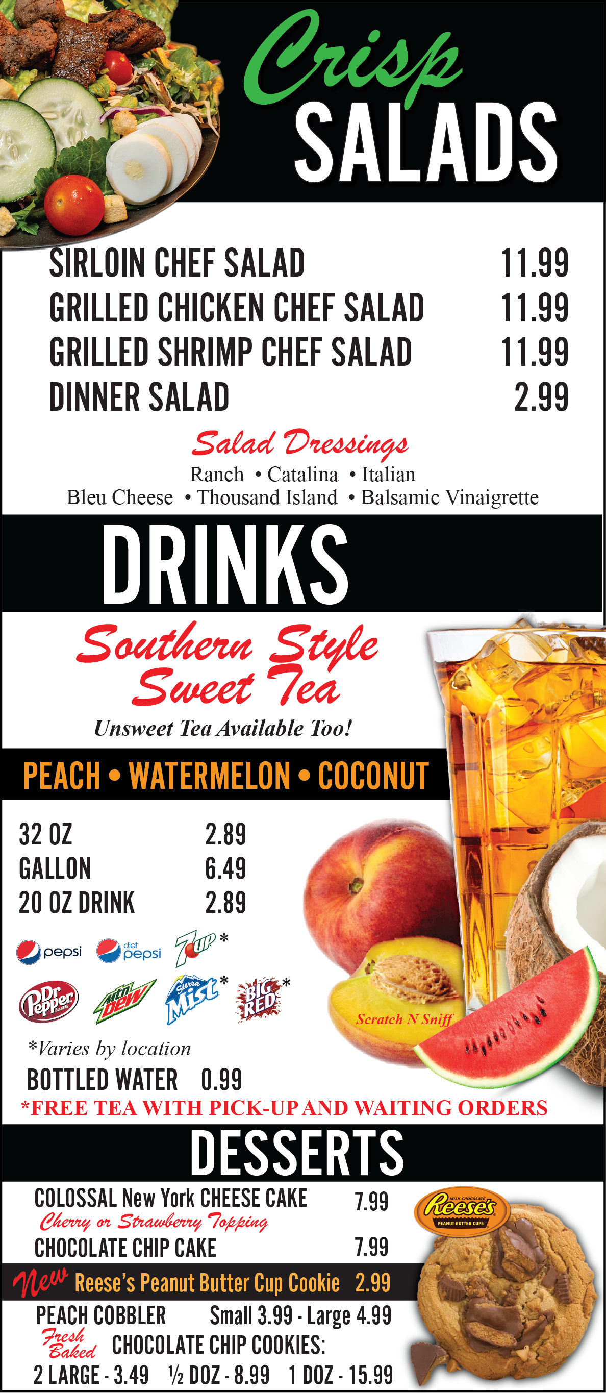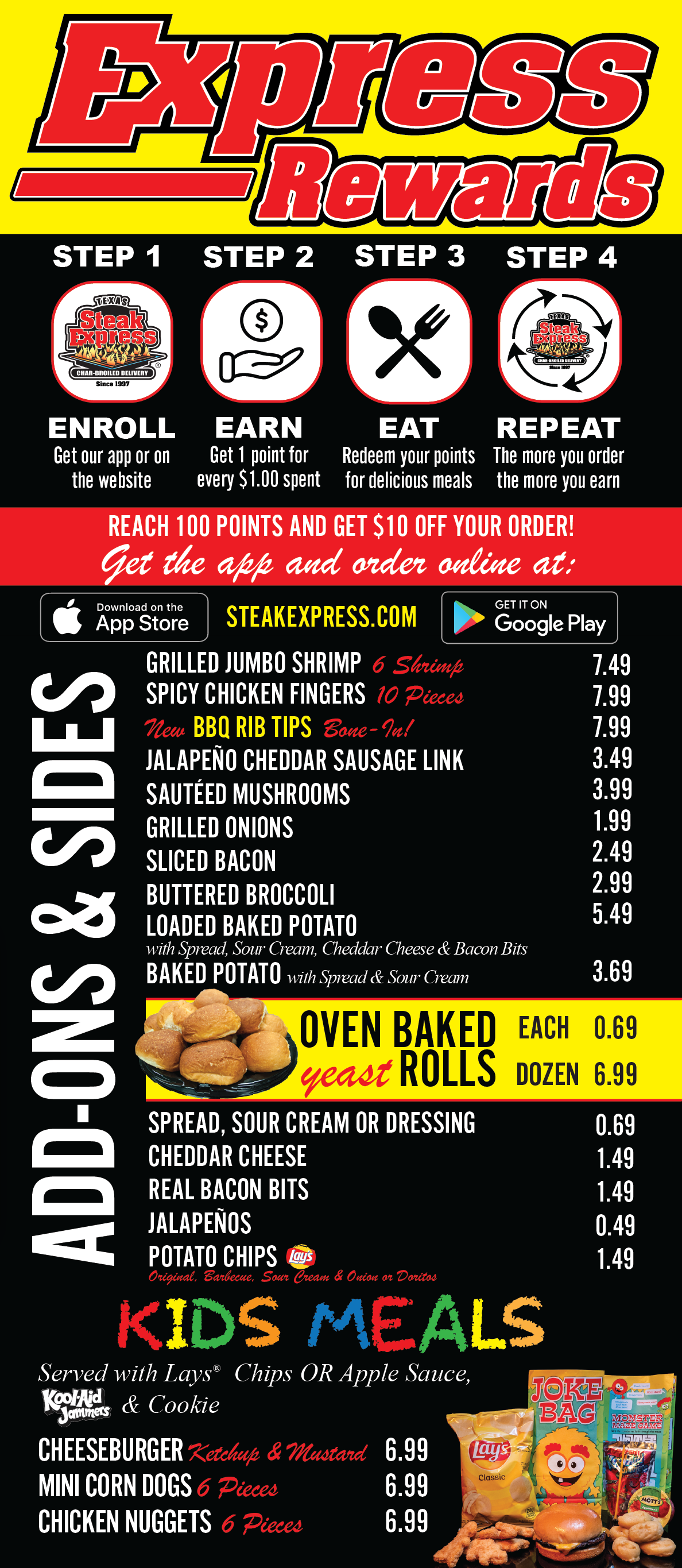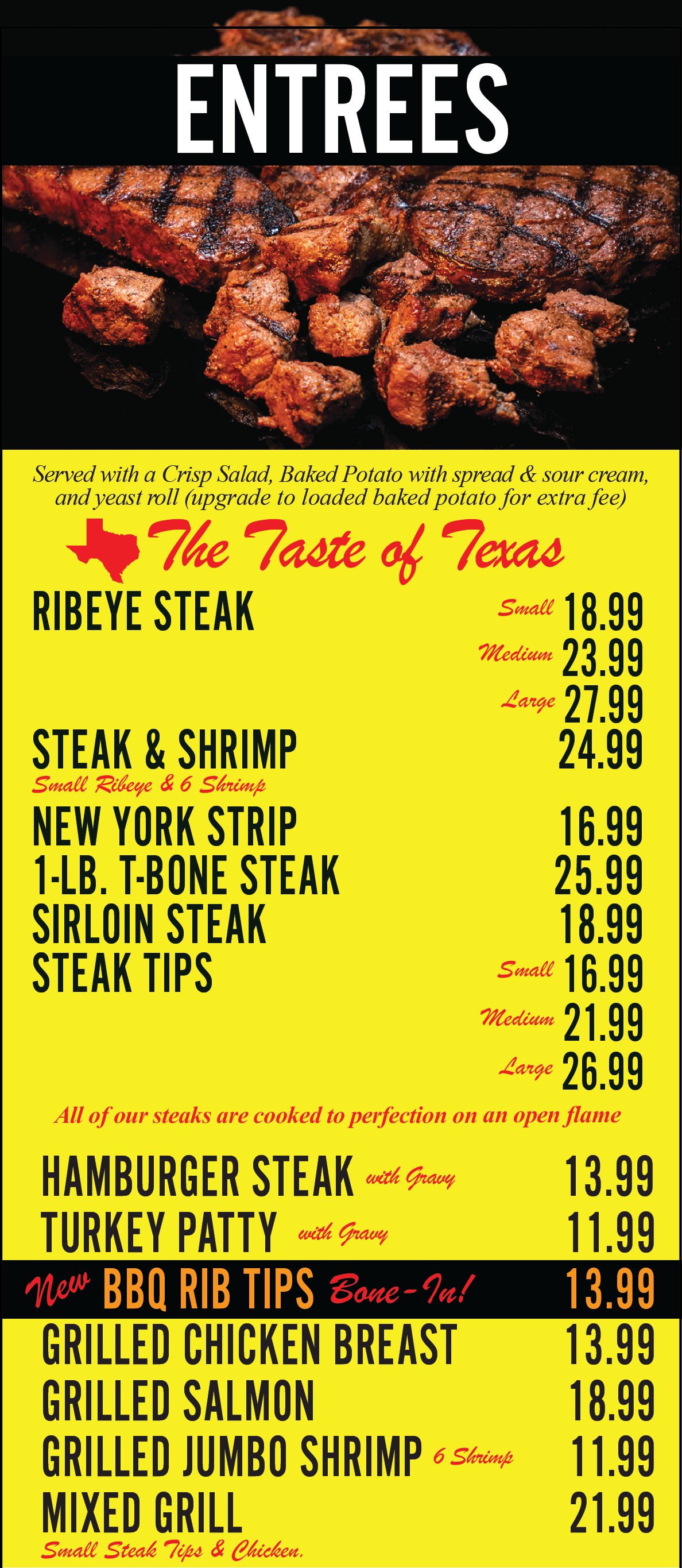 Prices subject to change without notice due to market conditions. Consuming raw or undercooked meats, poultry, or fish may increase your risk of food-born illness. Steaks are cooked to order.
