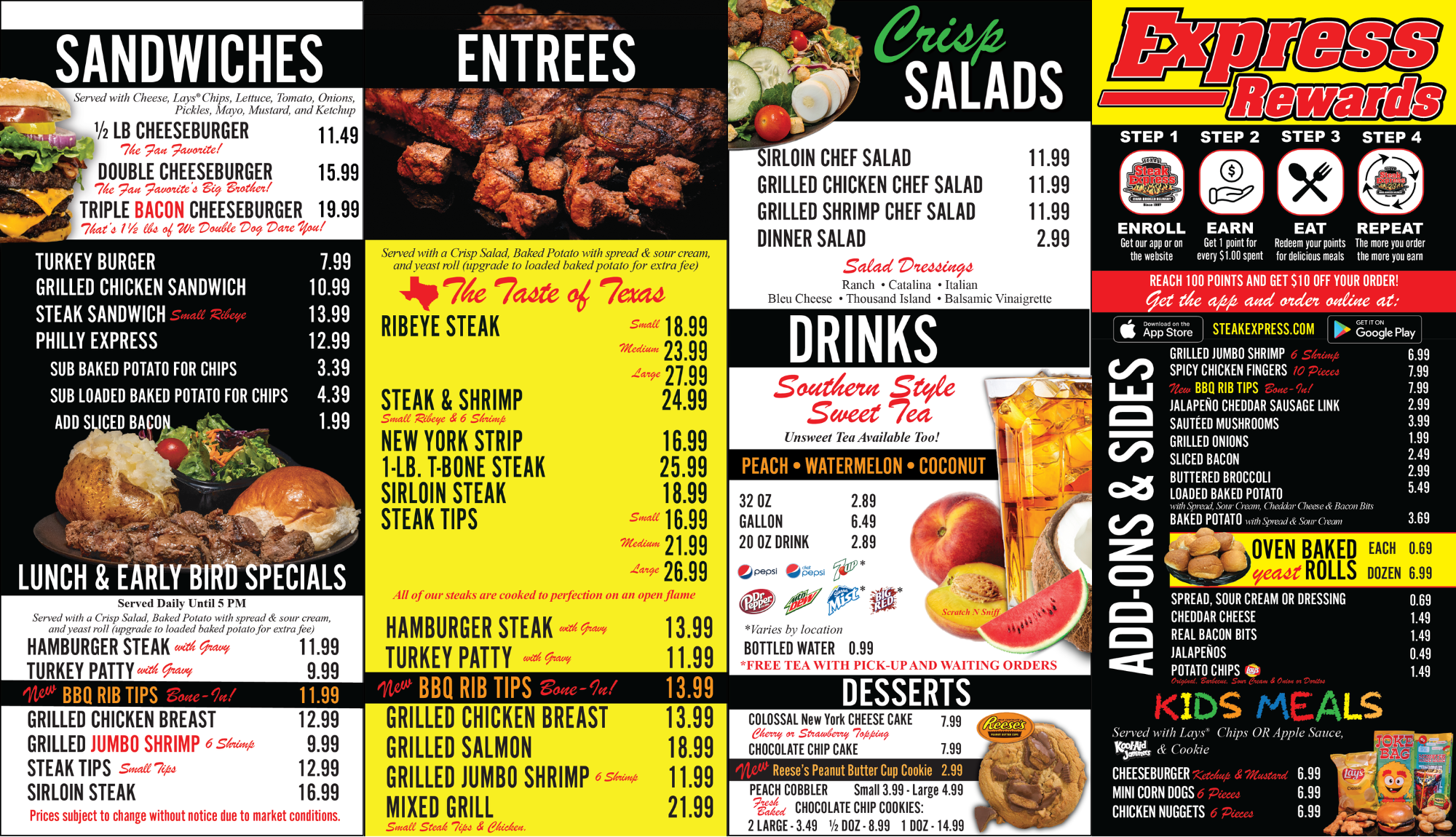 Prices subject to change without notice due to market conditions. Consuming raw or undercooked meats, poultry, or fish may increase your risk of food-born illness. Steaks are cooked to order. Free tea is valid on Pick-Up and Waiting orders only. Some restrictions apply. See store for details